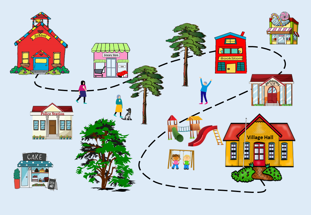 The scene is the meeting room of a village hall. A treasure trail has been taking place on a route starting at the village school and ending at the village hall for refreshments.