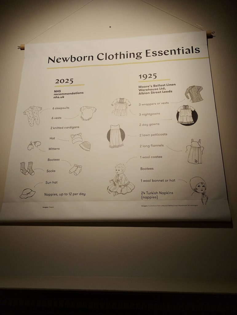 Having discussed everything from changes in children’s footwear, the concept of traditional colours for boys and girls, how the essentials for new babies has changed in 100 years, to 1950s knitting patterns and how advertising has influenced children’s fashion, it was very interesting to see the wide variety of artifacts displayed.