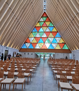 The Cardboard or Transitional Cathedral in Christchurch NZ was built to replace Christchurch Cathedral which was badly damaged in an earthquake in 2011. It was designed by the Japanese architect Shigeru Ban (sometimes known as “the disaster architect”), and it gets its nickname from the use of over 90 large cardboard tubes for its walls and roof.