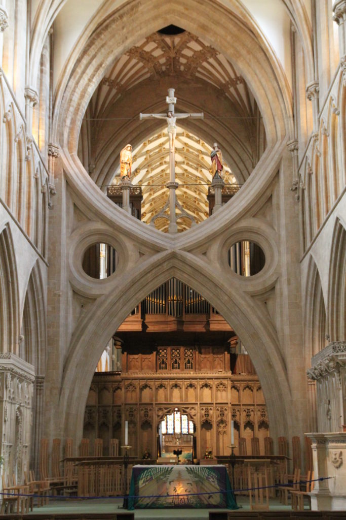 Wells Cathedral, Somerset, is most famous for its 3 spectacular scissor arches. These are unique 14th-century structural reinforcements designed by mason William Joy between 1338-1348. They were built to prevent the collapse of the central tower, which was sinking under its own weight, by creating a braced “scissor” shape to redistribute weight and stabilise the structure.