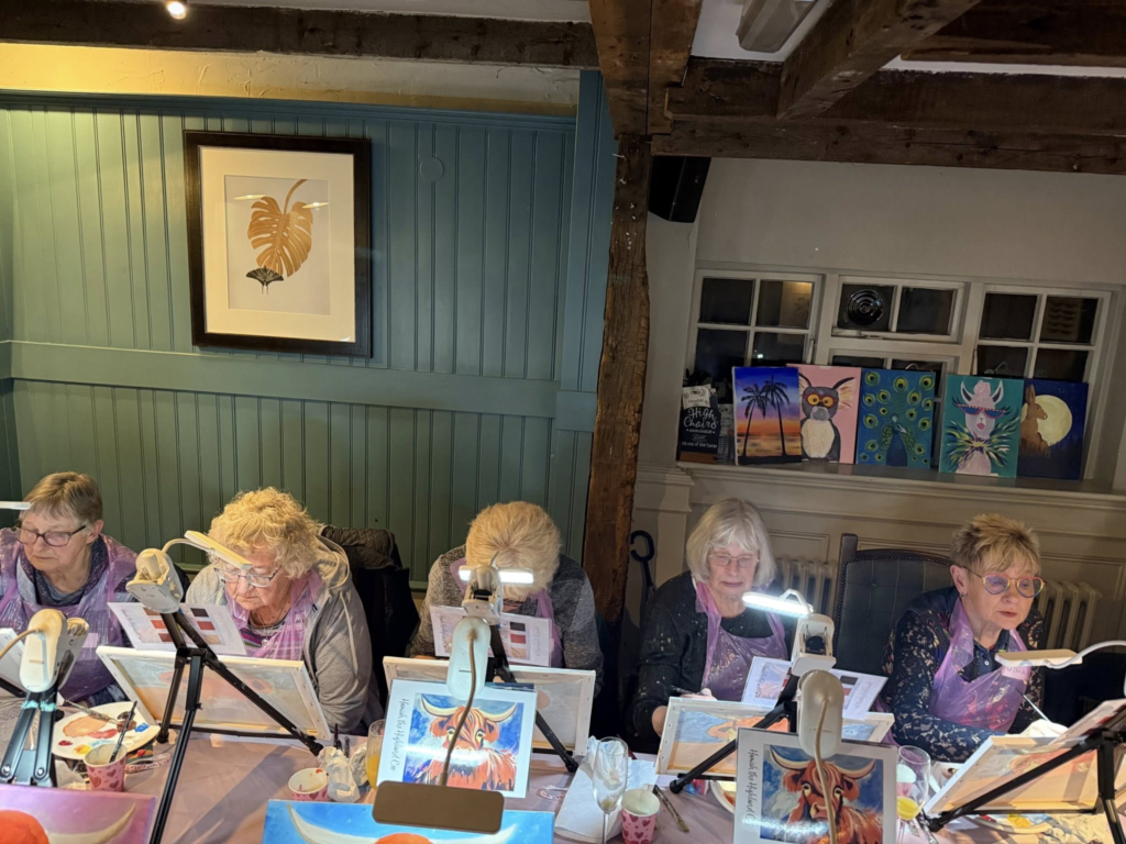 5 of us attended Fizzcasso’s Paint and Sip event painting a highland cow this evening. What great fun! A glass of Buck’s Fizz, a fetching pink pinny and a canvas with instructions from an expert on the painting of an highland cow. Here are some photos of the evening.