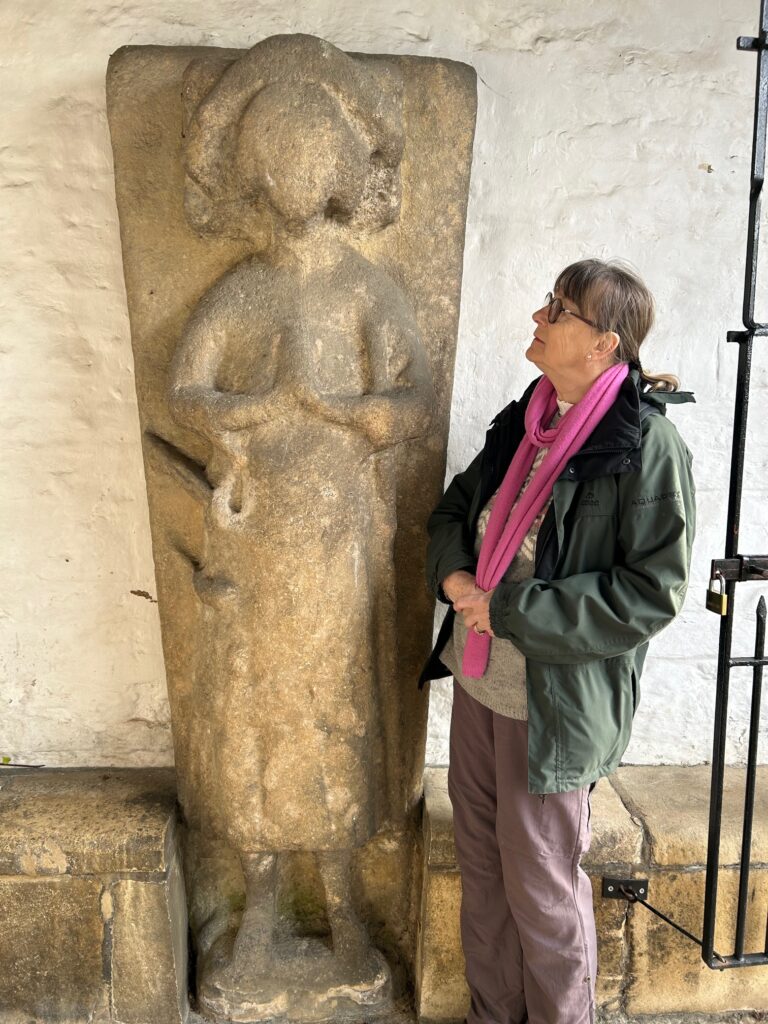 Jilly in the south porch looking at one of the 12th C stone tomb effigies.